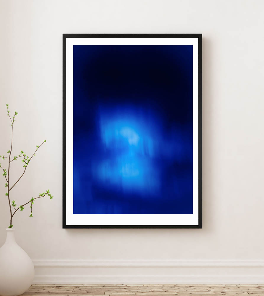 Soma, one of the early images from the M.M.I.M H series. Pale blue abstracted waves splash against a midnight blue background. Captured late at night strolling along the beach under a full moon, using only the light of the moon to capture the movement of the waves.A piece that to me feel both intimate and vast, like a fragment of ocean memory.